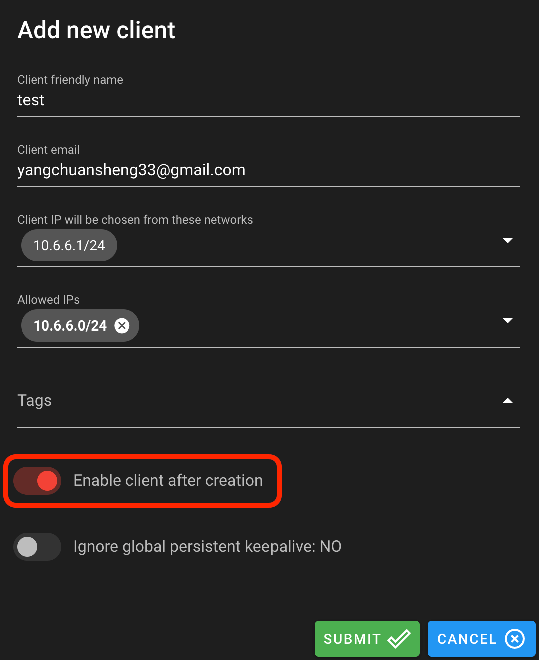 如果勾选了 “Enable client after creation”,还会将 peer 的配置加入 wg0.conf: