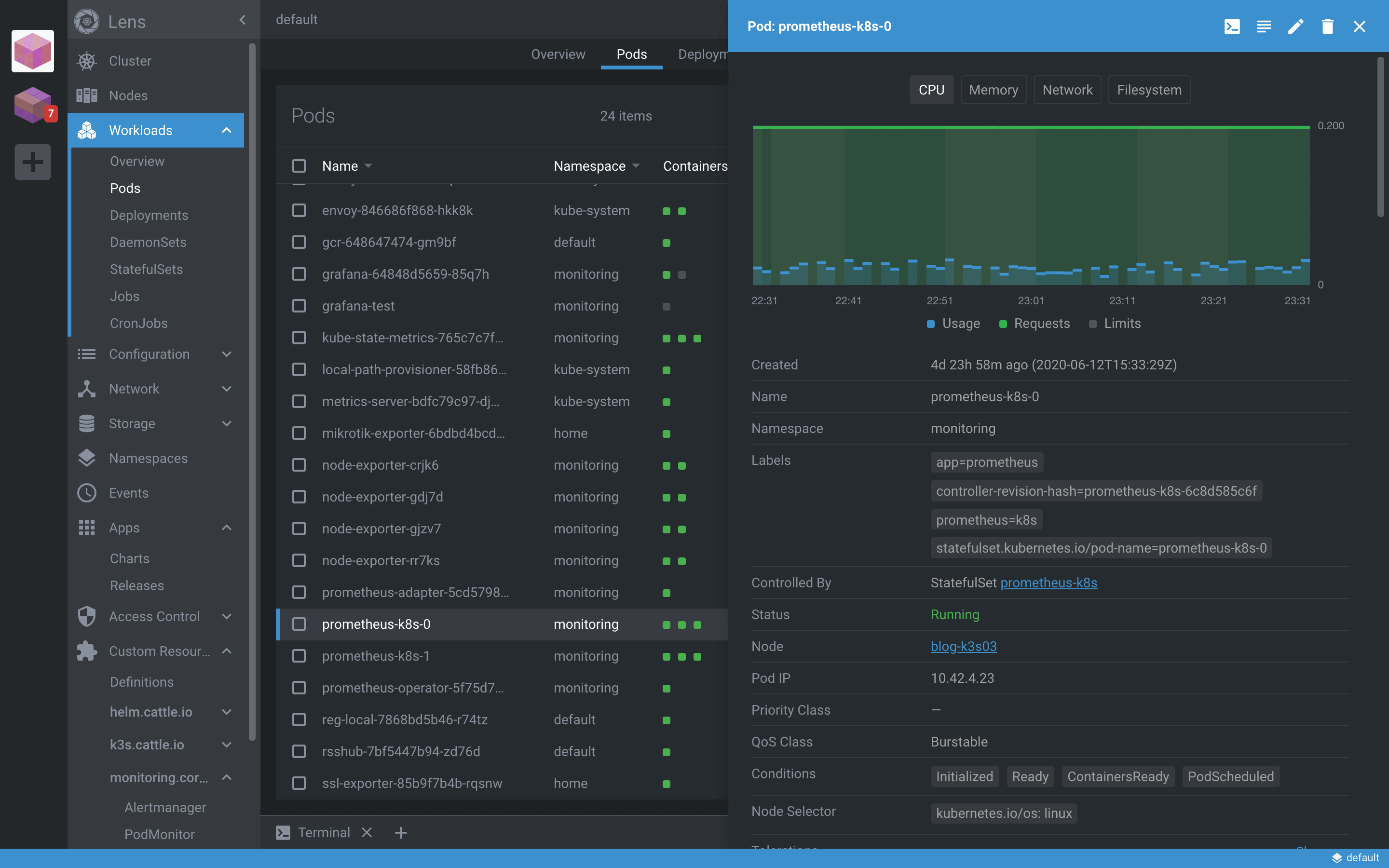 Lens 的 APP 改变了这个格局,功能比 Kubernetic 多,使用体验更好,适合广大系统重启工程师装逼。它有以下几个亮点: