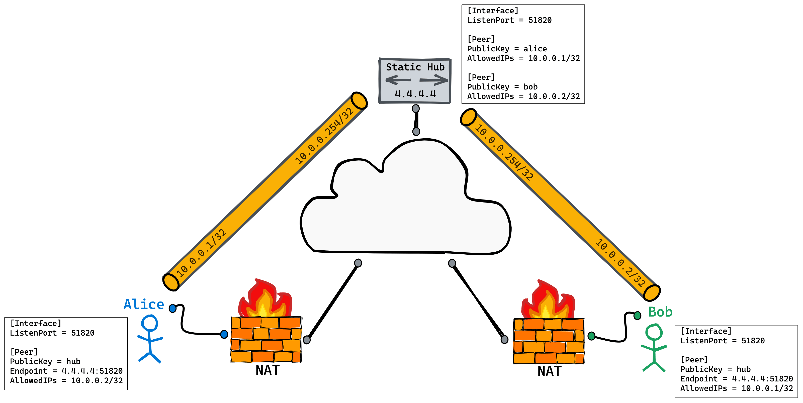 本文想探讨的是 Alice 和 Bob 之间直接建立隧道,中心辐射型(hub-and-spoke)网络拓扑是无法做到的。