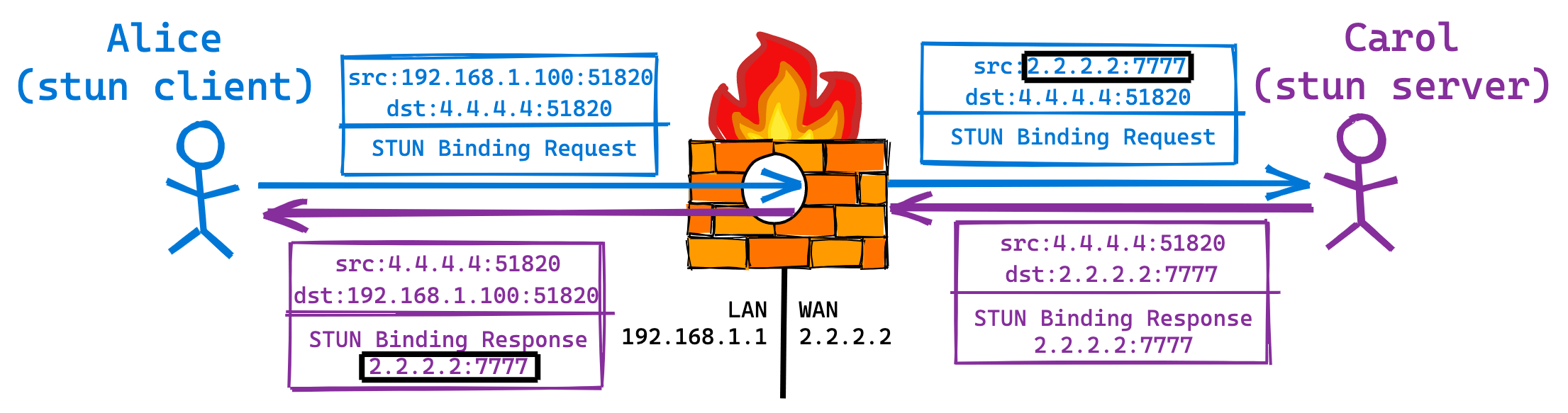 STUN 是一个客户端-服务端协议,在上图的例子中,Alice 是客户端,Carol 是服务端。Alice 向 Carol 发送一个 STUN Binding 请求,当 Binding 请求通过 Alice 的 NAT 时,源 IP:Port 会被重写。当 Carol 收到 Binding 请求后,会将三层和四层的源 IP:Port 复制到 Binding 响应的有效载荷中,并将其发送给 Alice。Binding 响应通过 Alice 的 NAT 转发到内网的 Alice,此时的目标 IP:Port 被重写成了内网地址,但有效载荷保持不变。Alice 收到 Binding 响应后,就会意识到这个 Socket 的公网 IP:Port 是 2.2.2.2:7777。