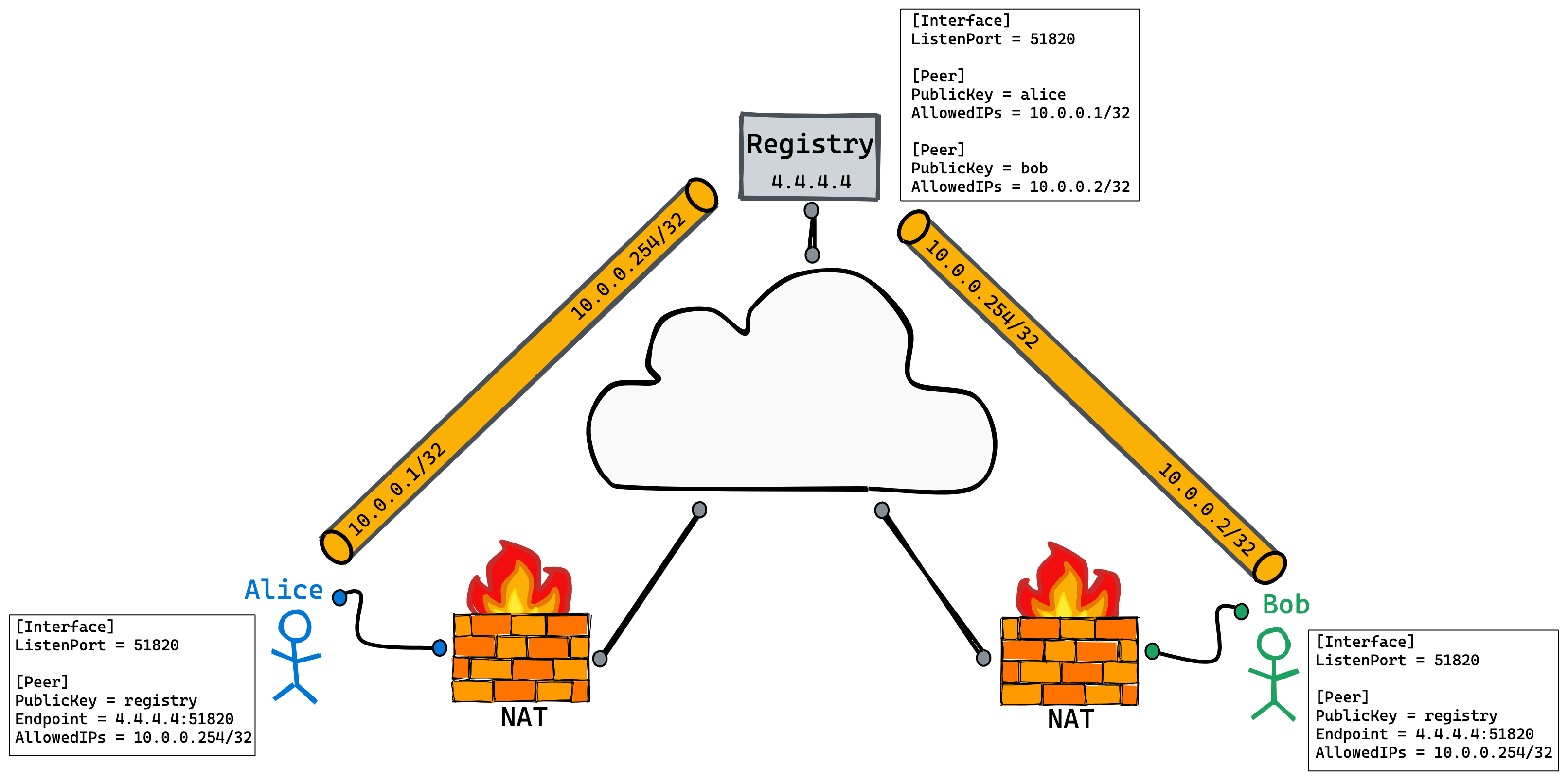 你可能会认为这是个中心辐射型(hub-and-spoke)网络拓扑,但实际上还是有些区别的,这里的 Registry Peer 不会充当网关的角色,因为它没有相应的路由,不会转发流量。Registry 的 WireGuard 接口地址为 10.0.0.254/32,Alice 和 Bob 的 AllowedIPs 中只包含了 10.0.0.254/32,表示只接收来自 Registry 的流量,所以 Alice 和 Bob 之间无法通过 Registry 来进行通信。