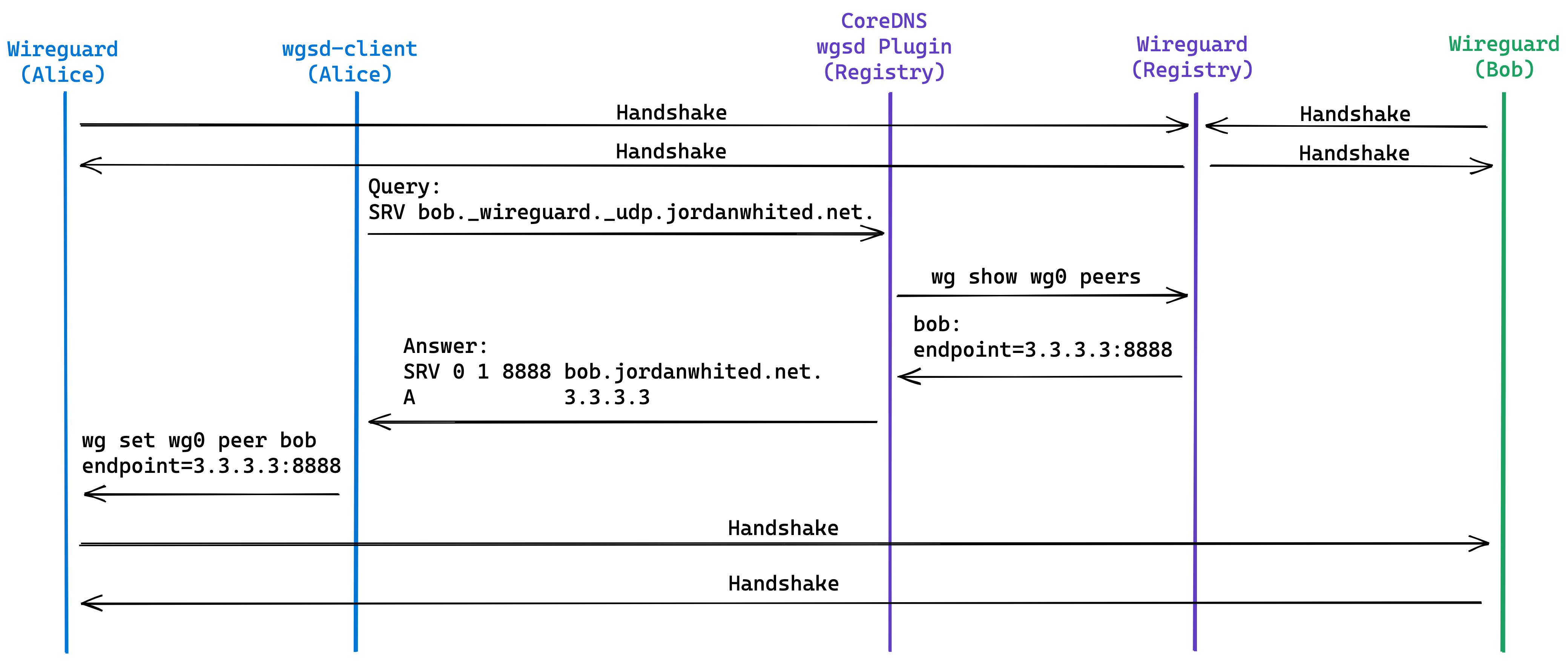 一开始,Alice 和 Bob 分别与 Registry 建立了隧道;接下来,Alice 上的 wgsd-client 向 Registry 节点上运行的 CoreDNS插件(wgsd)发起查询请求,该插件从 WireGuard 信息中检索 Bob 的 endpoint 信息,并将其返回给 wgsd-client;然后 wgsd-client 开始设置 Bob 的 endpoint;最后 Alice 和 Bob 之间直接建立了一条隧道。