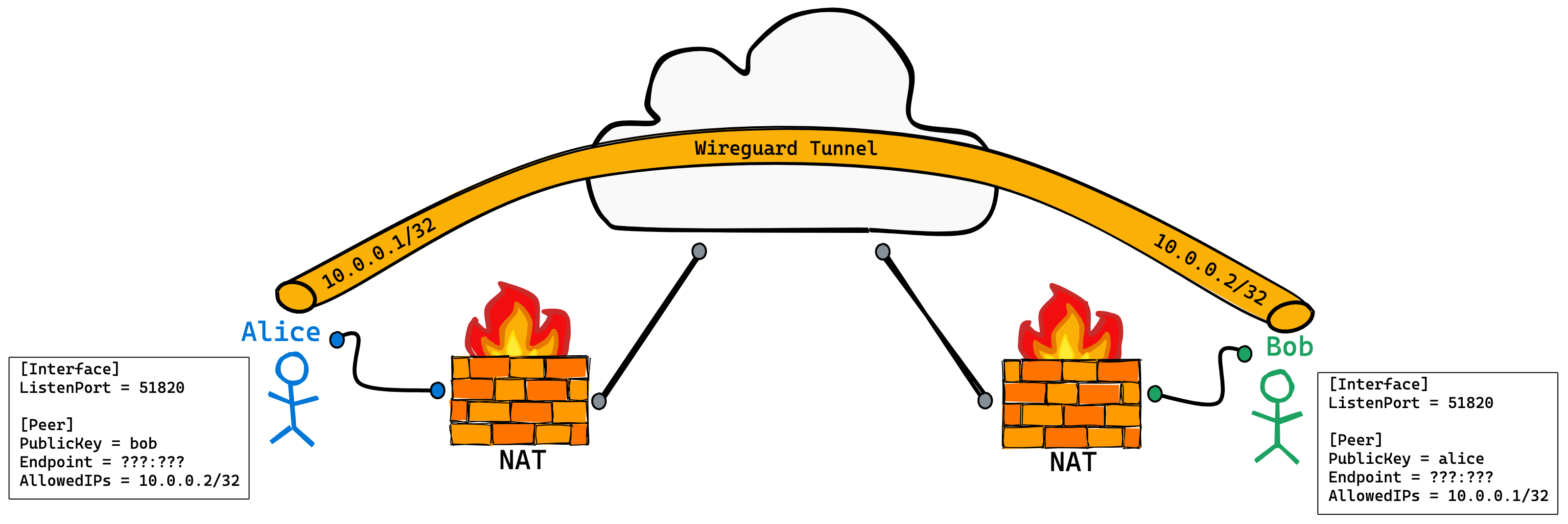 要想在 Alice 和 Bob 之间直接建立一个 WireGuard 隧道,就需要它们能够穿过挡在它们面前的 NAT。由于 WireGuard 是通过 UDP 来相互通信的,所以理论上